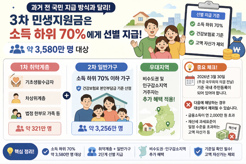 과거 전 국민 지급 방식과 달리, 이번에는 **소득 하위 70%**에 해당하는 약 3,580만 명을 대상으로 선별 지급합니다.