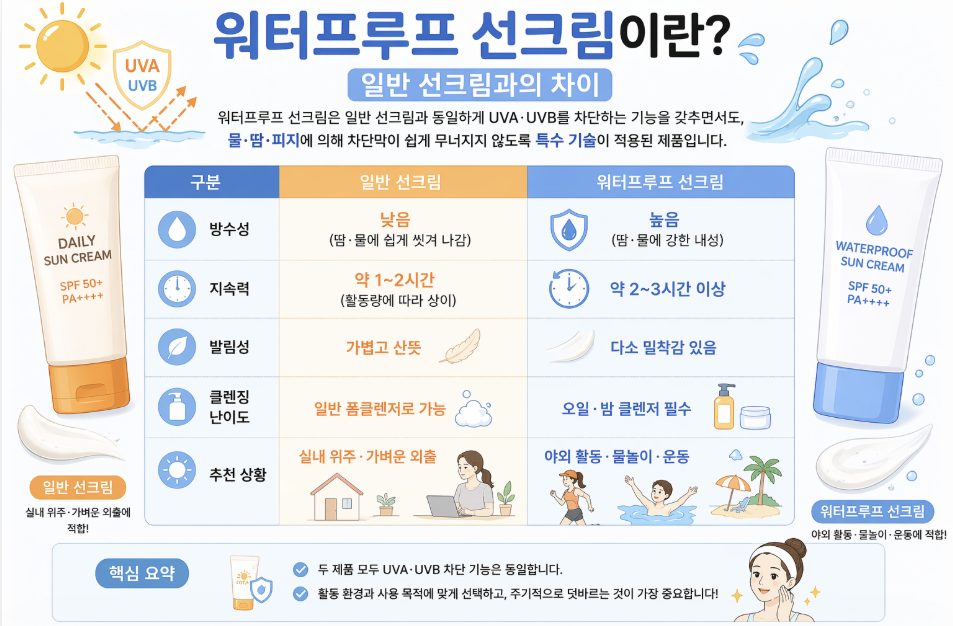워터프루프 선크림은 일반 선크림과 동일하게 UVA·UVB를 차단하는 기능을 갖추면서도, 물·땀·피지에 의해 차단막이 쉽게 무너지지 않도록 특수 기술이 적용된 제품입니다.