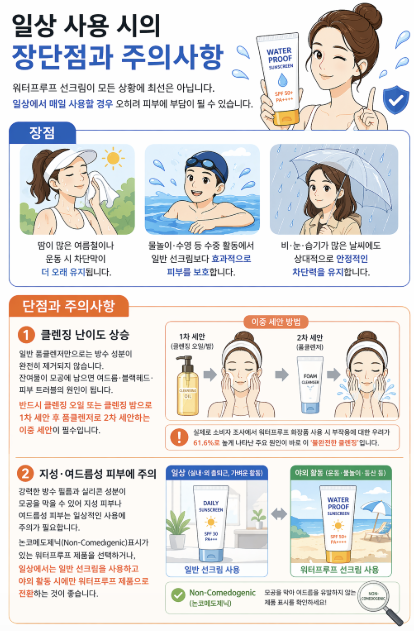 ② 지성·여드름성 피부에 주의 강력한 방수 필름과 실리콘 성분이 모공을 막을 수 있어 지성 피부나 여드름성 피부는 일상적인 사용에 주의가 필요합니다. 논코메도제닉(Non-Comedogenic) 표시가 있는 워터프루프 제품을 선택하거나, 일상에서는 일반 선크림을 사용하고 야외 활동 시에만 워터프루프 제품으로 전환하는 것이 좋습니다.