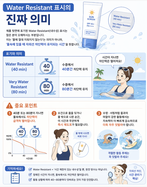 제품 뒷면에 표기된 Water Resistant(내수성) 표시는 많은 분이 오해하시는 부분입니다. 이는 '물에 절대 지워지지 않는다'는 의미가 아니라, **'물속에 있을 때 자외선 차단력이 유지되는 시간'**을 뜻합니다.