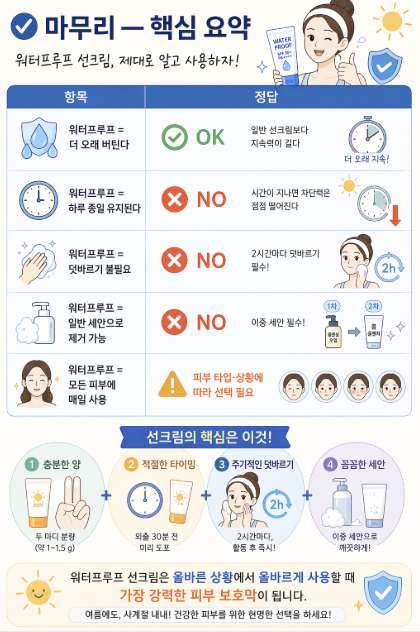 선크림의 핵심은 제품의 종류보다 충분한 양·적절한 타이밍·주기적인 덧바르기·꼼꼼한 세안이라는 점을 꼭 기억하세요. 워터프루프 선크림은 올바른 상황에서 올바르게 사용할 때 가장 강력한 피부 보호막이 됩니다.