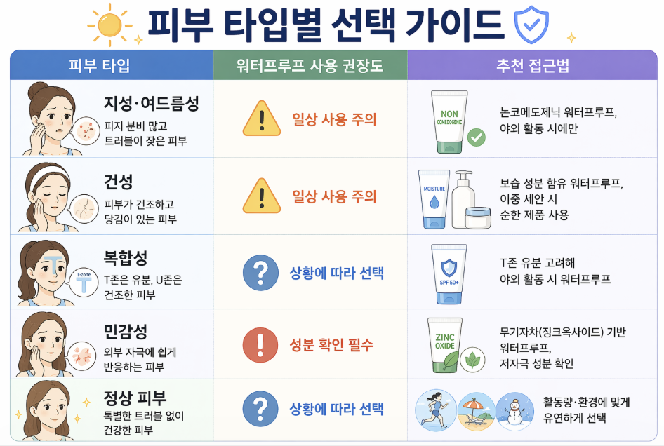 | 워터프루프 = 모든 피부에 매일 사용 | 피부 타입·상황에 따라 선택 필요 |