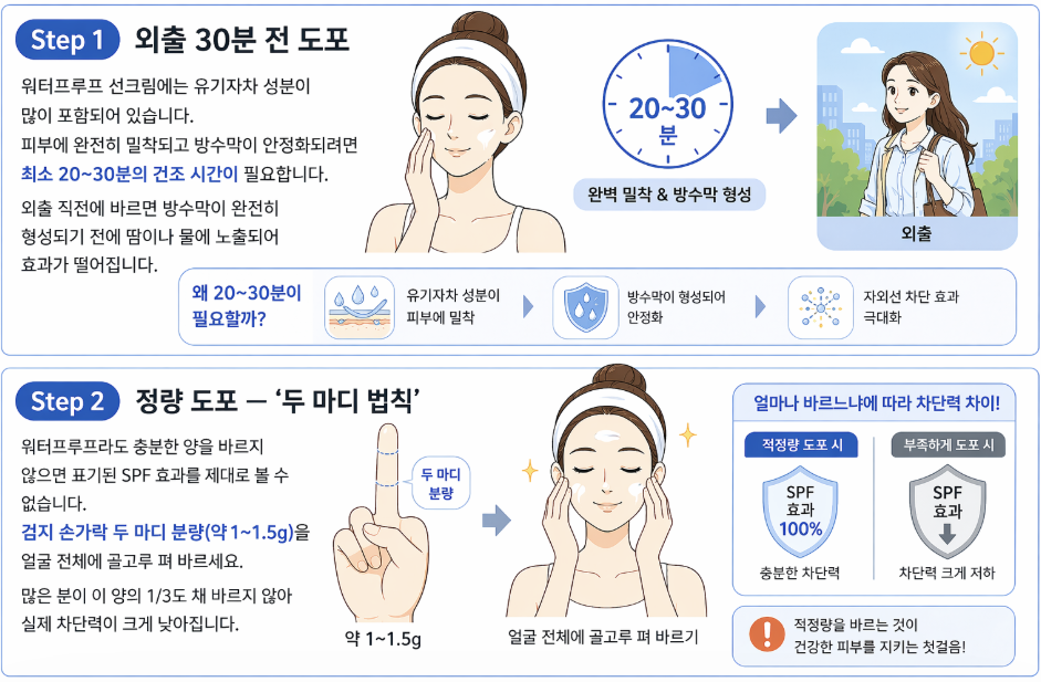 워터프루프라도 충분한 양을 바르지 않으면 표기된 SPF 효과를 제대로 볼 수 없습니다. **검지 손가락 두 마디 분량(약 1~1.5g)**을 얼굴 전체에 골고루 펴 바르세요. 많은 분이 이 양의 1/3도 채 바르지 않아 실제 차단력이 크게 낮아집니다.