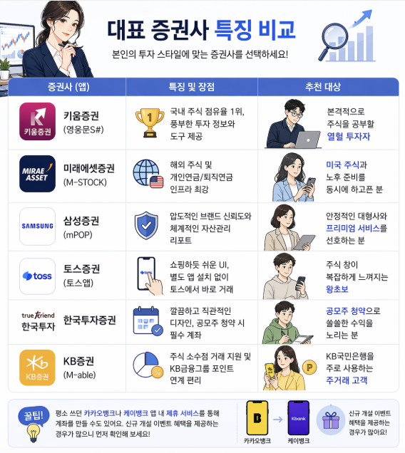대표적인 증권사와 각각의 특징을 정리했어요. 본인의 투자 스타일에 맞는 곳을 선택하면 됩니다.