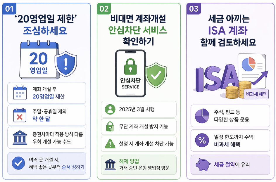 다만 이 제한은 증권사마다 적용 방식이 달라요. 일부 증권사는 제한이 없거나, 카카오뱅크·케이뱅크 연계를 통해 우회 개설이 가능한 경우도 있습니다. 개설하고 싶은 증권사가 여러 곳이라면, 혜택이 가장 좋은 곳부터 순서를 잘 정해서 만드는 것이 좋습니다.