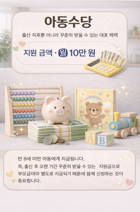 만 8세 미만 아동에게 지급됩니다. 즉, 출산 후 오랜 기간 꾸준히 받을 수 있는 지원금으로 부모급여와 별도로 지급되기 때문에 함께 신청하는 것이 중요합니다.