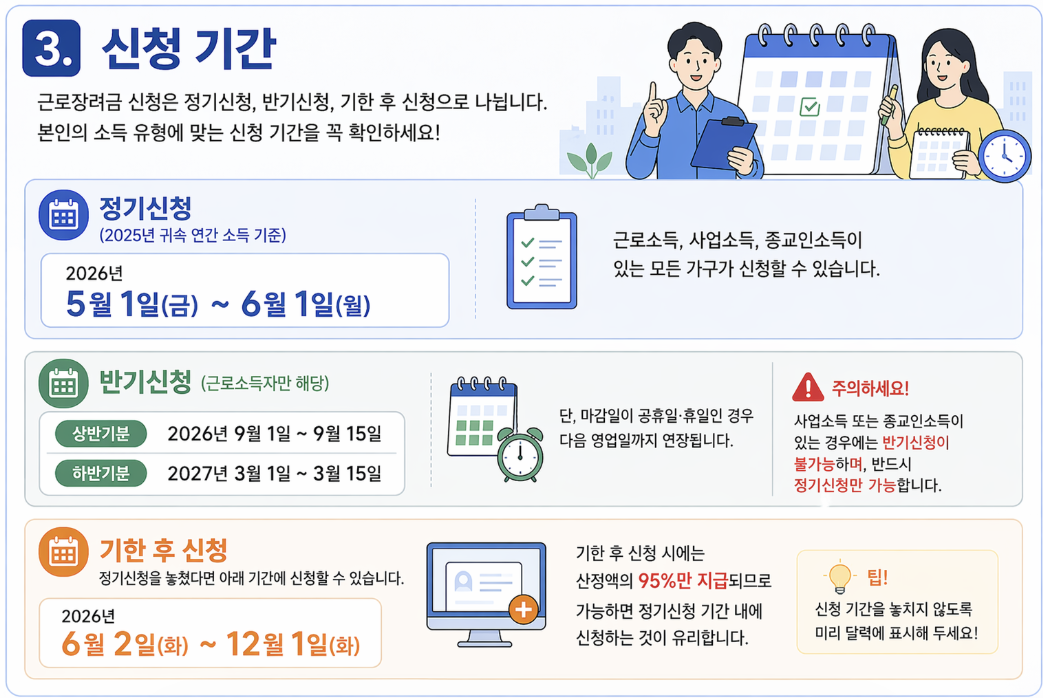 📌 정리: 2026년 정기신청 기간은 5월 1일~6월 1일, 지급은 9월 말까지입니다. 홈택스 모의계산으로 내 예상 수령액을 먼저 확인하고, 기간 내에 꼭 신청하세요.