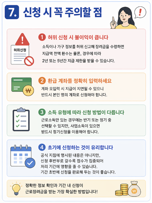 ① 허위 신청 시 불이익이 큽니다 소득이나 가구 정보를 허위 신고해 장려금을 수령하면 지급액 전액 환수는 물론, 경우에 따라 2년 또는 5년간 지급 제한을 받을 수 있습니다.