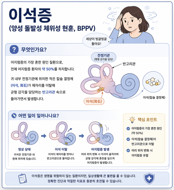 어지럼증의 가장 흔한 원인 질환으로, 전체 어지럼증 환자의 약 50%를 차지합니다. 귀 내부 전정기관에 위치한 작은 칼슘 결정체(이석, 耳石)가 제자리를 이탈해 균형 감각을 담당하는 반고리관 속으로 들어가면서 발생합니다.