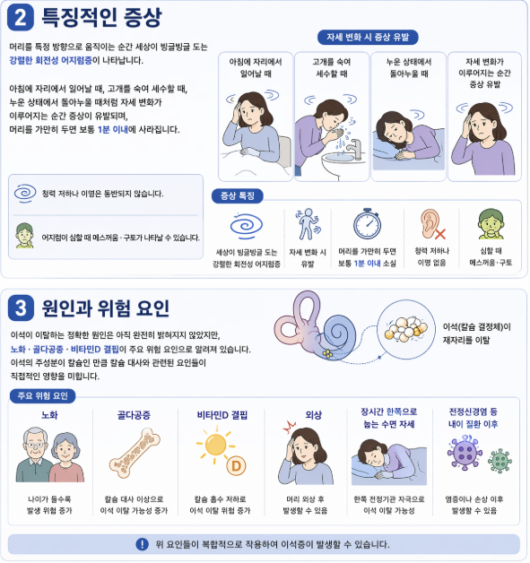 머리를 특정 방향으로 움직이는 순간 세상이 빙글빙글 도는 강렬한 회전성 어지럼증이 나타납니다. 아침에 자리에서 일어날 때, 고개를 숙여 세수할 때, 누운 상태에서 돌아누울 때처럼 자세 변화가 이루어지는 순간 증상이 유발되며, 머리를 가만히 두면 보통 1분 이내에 사라집니다. 청력 저하나 이명은 동반되지 않지만, 어지럼이 심할 때 메스꺼움·구토가 나타날 수 있습니다.