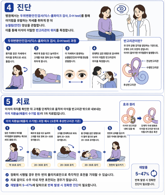 병원에서는 **두위변환안진검사(딕스-홀파이크 검사, D-H test)**를 통해 어지럼을 유발하는 자세를 취하게 한 뒤 눈떨림(안진) 양상을 관찰합니다. 이를 통해 이석이 이탈한 반고리관의 위치를 특정합니다.