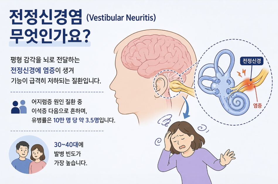 평형 감각을 뇌로 전달하는 전정신경에 염증이 생겨 기능이 급격히 저하되는 질환입니다. 어지럼증 원인 질환 중 이석증 다음으로 흔하며, 유병률은 10만 명 당 약 3.5명입니다. 30~40대에 발병 빈도가 가장 높습니다.